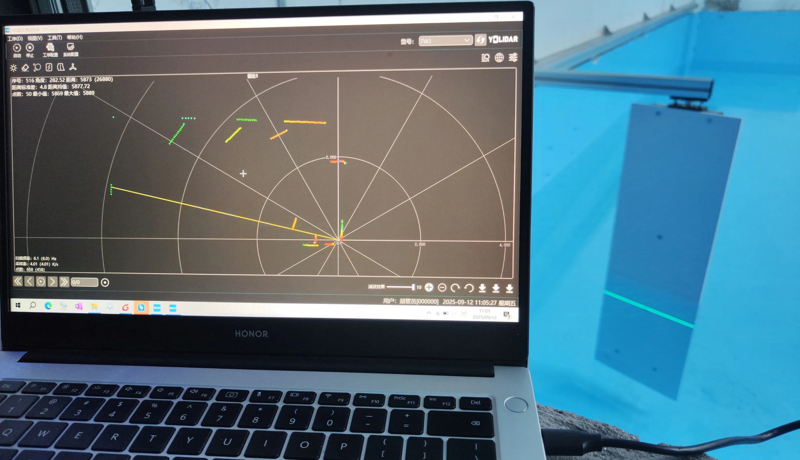 扫图测试:TW3固定于工装,置于泳池中扫图,点云输出正常,无断线、无噪点波动